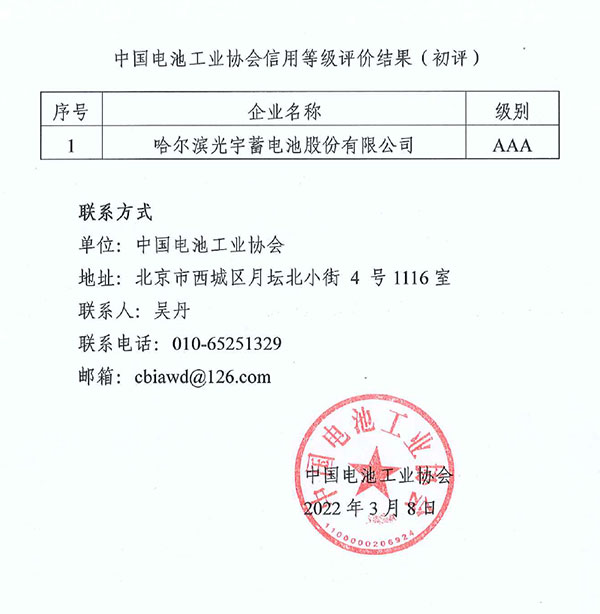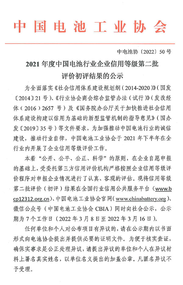 2022年3月8日,中國(guó)電池工業(yè)協(xié)會(huì)發(fā)布《2021年度中國(guó)電池行業(yè)企業(yè)信用等級(jí)第二批評(píng)價(jià)初評(píng)結(jié)果的公示》。
