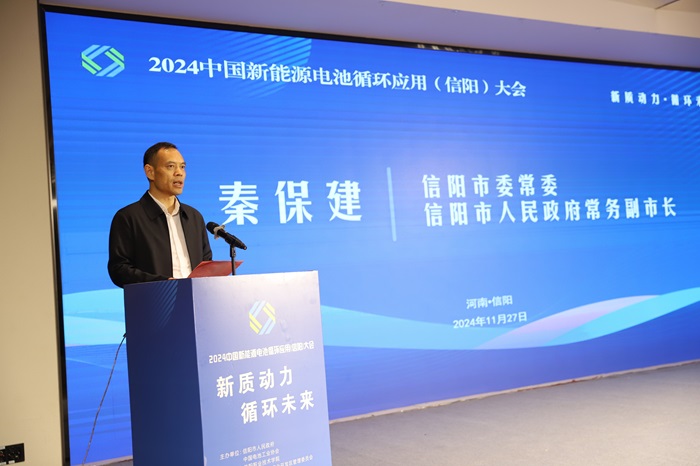 信陽(yáng)市委常委、常務(wù)副市長(zhǎng)秦保建為大會(huì)致辭,秦副市長(zhǎng)在致辭中表示,信陽(yáng)作為全國(guó)首批碳達(dá)峰試點(diǎn)城市和氣候投融資試點(diǎn)城市,擁有得天獨(dú)厚的生態(tài)資源,“綠電” 充沛,碳匯充裕。近年信陽(yáng)抓住新能源機(jī)遇,以其為首位產(chǎn)業(yè),打造能源體系、培育產(chǎn)業(yè)集群,推動(dòng)能源與產(chǎn)業(yè)升級(jí),已實(shí)施 270 個(gè)新能源項(xiàng)目,投資超千億,依托科研機(jī)構(gòu)和企業(yè)打造了完整產(chǎn)業(yè)鏈。同時(shí),信陽(yáng)今年出臺(tái) 12 條產(chǎn)業(yè)循環(huán)發(fā)展措施,從多方面營(yíng)造政策環(huán)境。此次大會(huì)恰逢其時(shí),將助力循環(huán)經(jīng)濟(jì),提供交流平臺(tái)與機(jī)遇。信陽(yáng)將借大會(huì)聚焦電池循環(huán)應(yīng)用產(chǎn)業(yè)鏈,加快中試基地建設(shè),推動(dòng)產(chǎn)業(yè)發(fā)展。