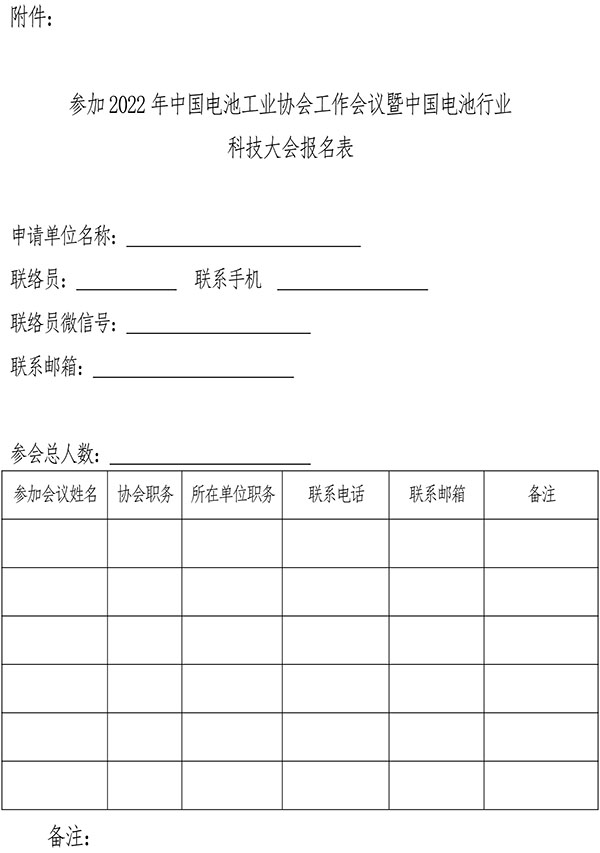 附件:參加2022年中國電池工業(yè)協(xié)會工作會議暨中國電池行業(yè)科技大會報(bào)名表