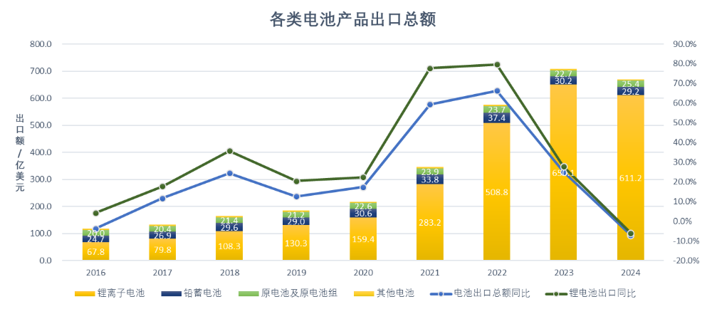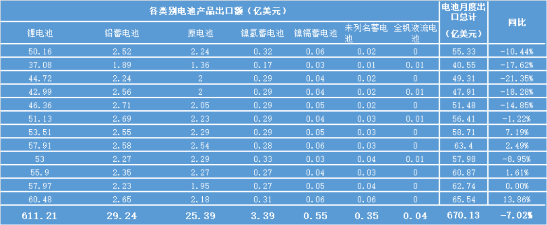 2024年,全球經(jīng)濟(jì)形勢的不穩(wěn)定、國際貿(mào)易摩擦加劇、全球電動(dòng)化進(jìn)程趨緩等多重因素,造成各國對電池的需求增長不及預(yù)期。疊加鋰電價(jià)格下滑,對我國出口額造成負(fù)面影響。據(jù)海關(guān)數(shù)據(jù),2024年我國電池產(chǎn)品累計(jì)出口約670.13億美元,同比下降7.02%。