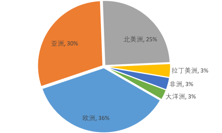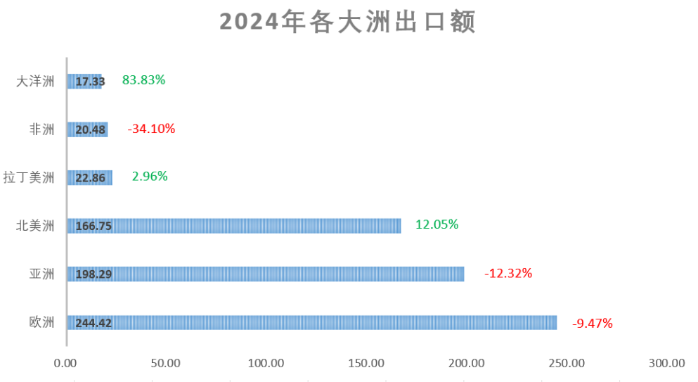 出口洲別地區(qū)中,按照出口額從高到低進(jìn)行排序依次為歐洲、亞洲、北美洲、拉丁美洲、非洲、大洋洲,出口額分別為244.42億美元、198.29億美元、166.75億美元、22.86億美元、20.48億美元、17.33億美元,占比分別為36%、30%、25%、3%、3%、3%??梢钥闯?,歐亞和北美市場是我國的重要出口市場,合計(jì)占總出口市場份額的91%。2024年,北美洲、大洋洲、拉丁美洲地區(qū)分別增長12.05%、83.83%、2.96%外,其它洲市場出口額同比均呈現(xiàn)下滑態(tài)勢。