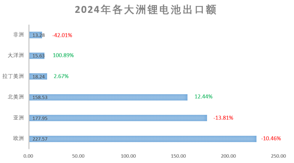 從鋰電池單一產(chǎn)品出口情況來看,鋰離子電池出口各大洲情況和電池整體出口情況相似,出口額從高到低依次是歐洲、亞洲、北美洲、拉丁美洲、非洲、大洋洲,出口額分別為227.57億美元、177.95億美元、158.53億美元、18.24億美元、15.63億美元和13.28億美元,分別占比37%、29%、26%、3%、3%和2%。其中,歐洲、亞洲和非洲出現(xiàn)同比下降,北美洲、拉丁美洲和大洋洲表現(xiàn)出同比增長,大洋洲增長最快,出口額翻番。