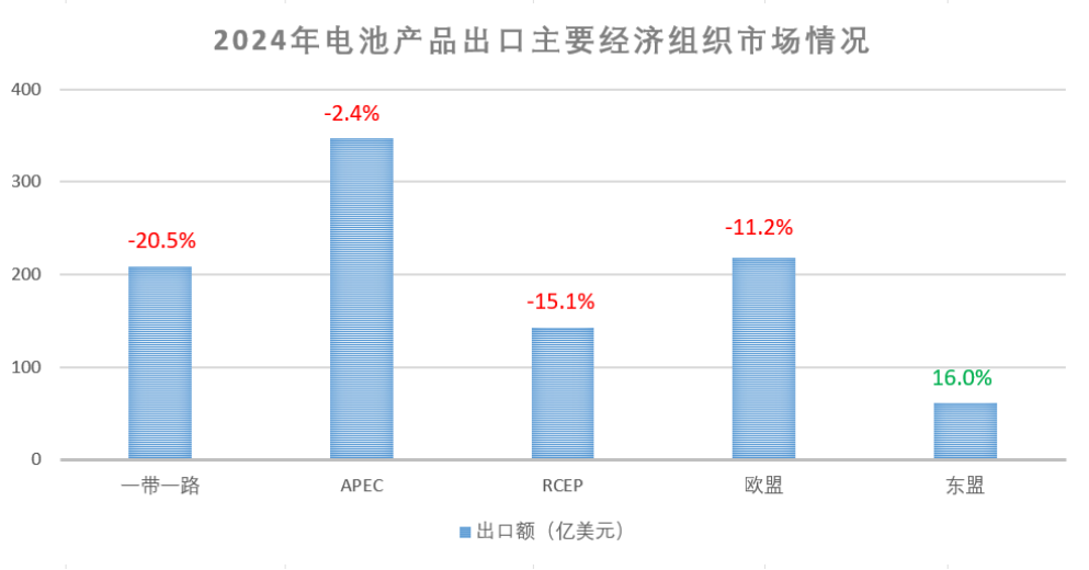 2024年,受全球經(jīng)濟(jì)形勢不穩(wěn)定的影響,各經(jīng)濟(jì)組織對我國進(jìn)口電池產(chǎn)品與去年出現(xiàn)較大起伏。按出口額從高到低排序,亞太經(jīng)合組織(APEC)出口346.98億美元,同比下降2.4%;歐盟出口217.42億美元,同比下降11.2%;“一帶一路”沿線國家出口208.45億美元,同比下降20.5%;RCEP出口142.40億美元,同比下降15.1%;東盟出口61.61億美元,同比增長16.0%。受價(jià)格下跌影響,除東盟出現(xiàn)同比增長外,其它主要經(jīng)濟(jì)組織都出現(xiàn)不同程度的同比下降,其中“一帶一路”沿線國家的同比下降幅度最大,為20.5%。