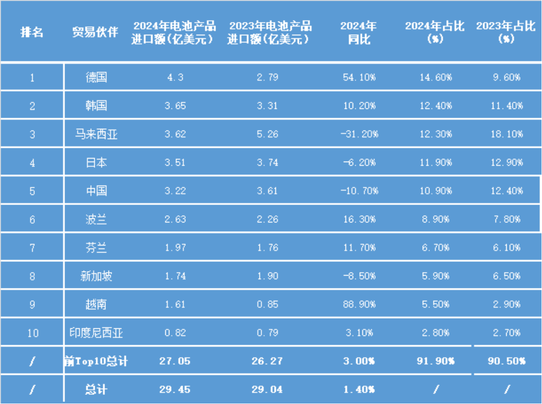 從單一進(jìn)口國家/地區(qū)來看,2024年我國電池產(chǎn)品進(jìn)口額排名TOP10的市場分別是:德國、韓國、馬來西亞、日本、中國、波蘭、芬蘭、新加坡、越南和印度尼西亞,共計(jì)進(jìn)口27.05億美元,占我國電池產(chǎn)品全部進(jìn)口額的91.9%。