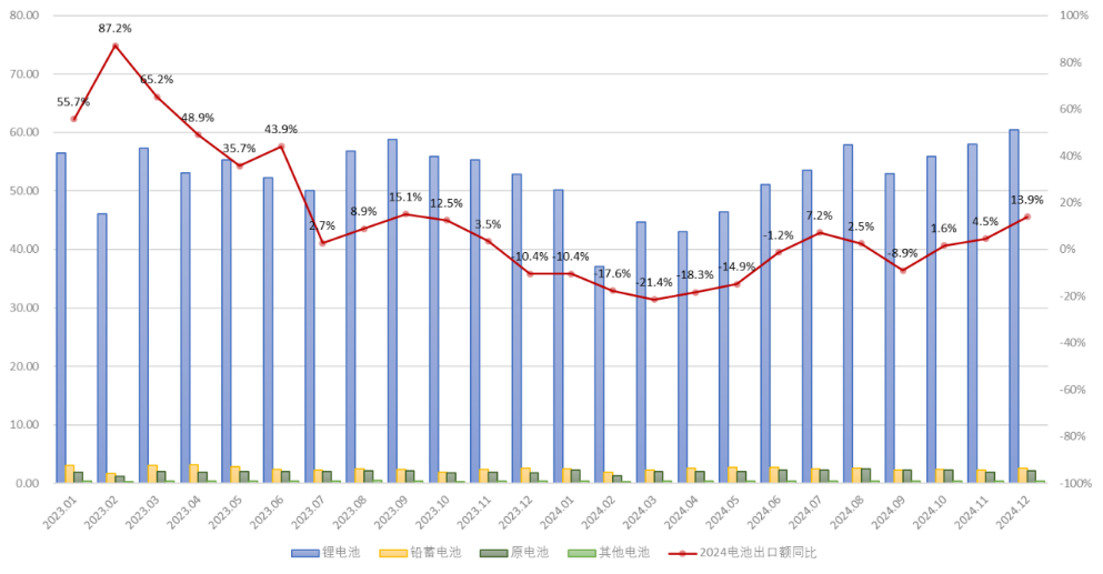 分月來看,電池產(chǎn)品2024年月度出口額較2023年出口額整體下滑,呈現(xiàn)上半年下滑明顯,下半年波動(dòng)回升趨勢。其中,1-5月相對去年同期降幅較大,6月開始出口額拉升回暖至-1.2%,7月出現(xiàn)較大增幅至7.2%,9月再次下滑,10-12月保持逐月增長態(tài)勢且超過同期水平,12月同比增長13.9%。