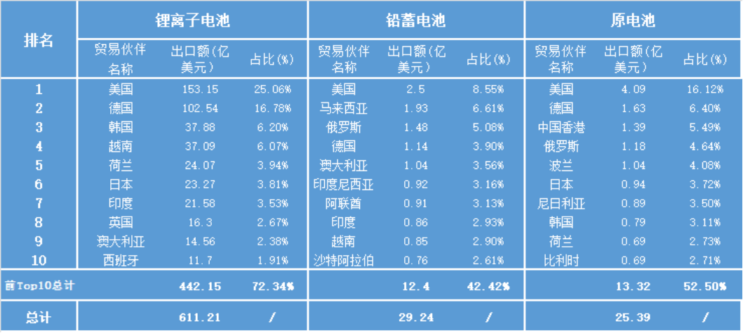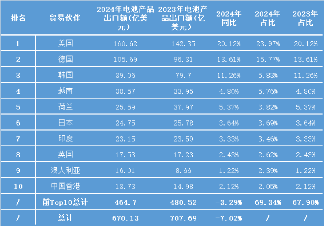 2024年電池產(chǎn)品出口額TOP10國家/地區(qū)