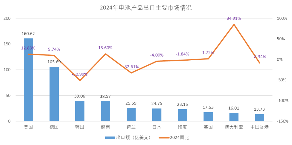從單一出口目的地來看,2024年我國電池產(chǎn)品出口額排名TOP10的市場分別是:美國、德國、韓國、越南、荷蘭、日本、印度、英國、澳大利亞、中國香港。其中越南超過荷蘭由2023年的第五位躍升至第四位,英國由2023年的第十位升至到第八位,澳大利亞、中國香港則升至前十名。前TOP10市場出口額共計(jì)約464.70億美元,相較2023年同比下降3.29%;約占我國電池出口額69.34%,較2023年同期高1.44個(gè)百分點(diǎn)。美國依舊是我國電池產(chǎn)品出口最大的單一市場,2024年出口到美國市場的我國電池產(chǎn)品金額約160.62億美元,占我國電池出口額23.97%,同比增幅約3.85個(gè)百分點(diǎn)。其中,鋰離子電池出口額約153.15億美元,占美國市場出口額95.3%,同比增長13.03%;鉛蓄電池出口額約2.50億美元,同比增長約11.11%;原電池出口額約4.09億美元,同比增長約8.49%。