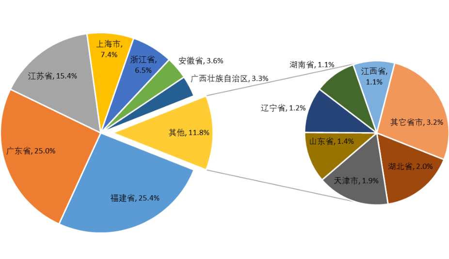 從各產(chǎn)區(qū)來看,福建省和廣東省電池出口分居出口前一二位。其中,福建省出口170.27億美元,同比下降8.31%,約占我國電池產(chǎn)品出口額25.41%。廣東省出口167.27億美元,同比下降2.45%,約占我國電池產(chǎn)品出口額24.96%。廣西、湖北等省市外貿(mào)出口同比增長明顯。其中,廣西壯族自治區(qū)出口額22.36億美元,同比增長高達(dá)95.13%,占出口總額3.34%,湖北出口額約13.10億美元,同比增長56.01%,占出口總額1.95%。江蘇、天津、上海等省市外貿(mào)出口額同比出現(xiàn)下滑,其中江蘇省出口額103.12億美元,占出口總額15.39%,同比下滑24.39%。