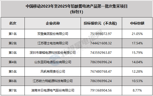 中國移動22日公示了2023年至2025年鉛酸蓄電池產(chǎn)品第一批次集采項目標包1的中標結(jié)果,雙登、理士、雄韜等7家中標。詳情如下: