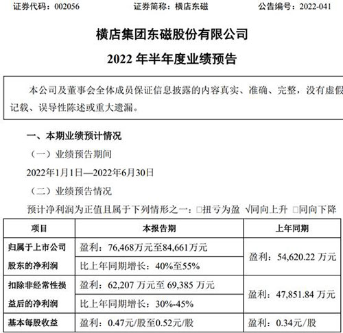 橫店?yáng)|磁:預(yù)計(jì)上半年凈利潤(rùn)7.65億元-8.47億元,同比增長(zhǎng)40%-55%