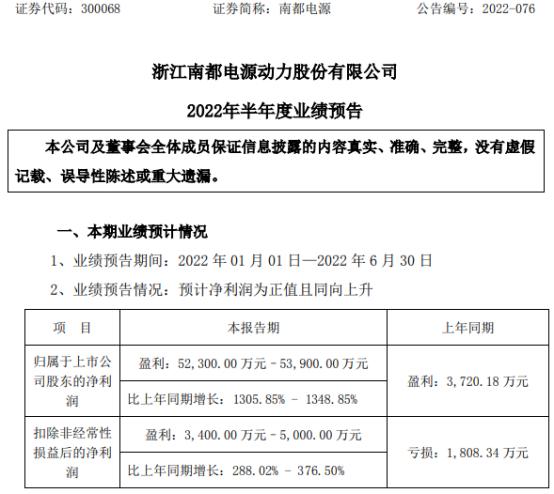 7月19日,南都電源(300068)近日發(fā)布2022年半年度業(yè)績預(yù)告,報告期內(nèi)歸屬于上市公司股東的凈利潤52,300.00萬元–53,900.00萬元,比上年同期增長1305.85%-1348.85%。
