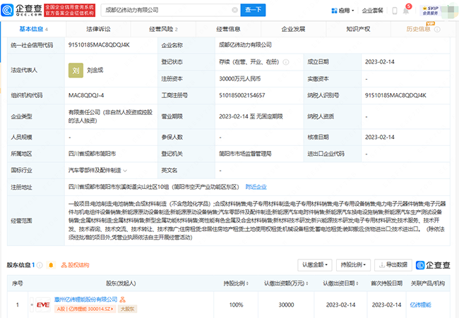 企查查APP顯示,2月14日,成都億緯動(dòng)力有限公司成立,法定代表人為劉金成,注冊(cè)資本3億元人民幣,經(jīng)營(yíng)范圍包含:新能源原動(dòng)設(shè)備制造;新能源原動(dòng)設(shè)備銷售;汽車零部件及配件制造;新能源汽車電附件銷售;新能源汽車換電設(shè)施銷售;新能源汽車生產(chǎn)測(cè)試設(shè)備銷售等。企查查股權(quán)穿透顯示,該公司由億緯鋰能(300014)100%控股。