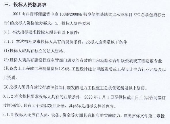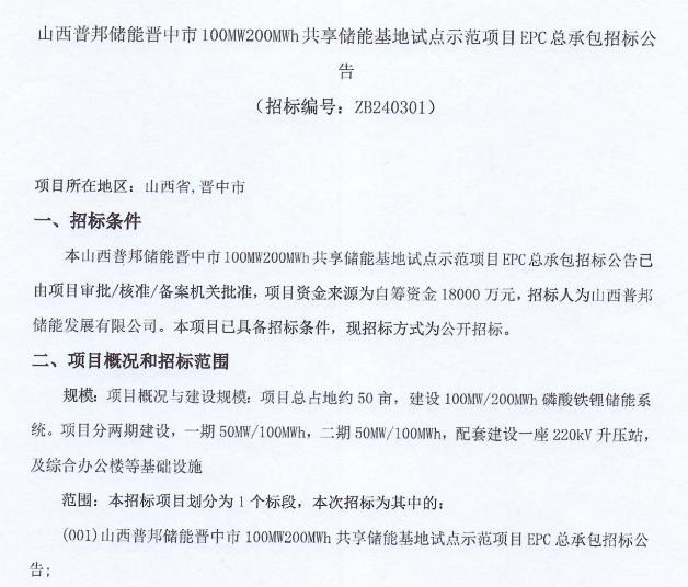 山西晉中100MW/200MWh共享儲(chǔ)能基地試點(diǎn)示范項(xiàng)目EPC招標(biāo)