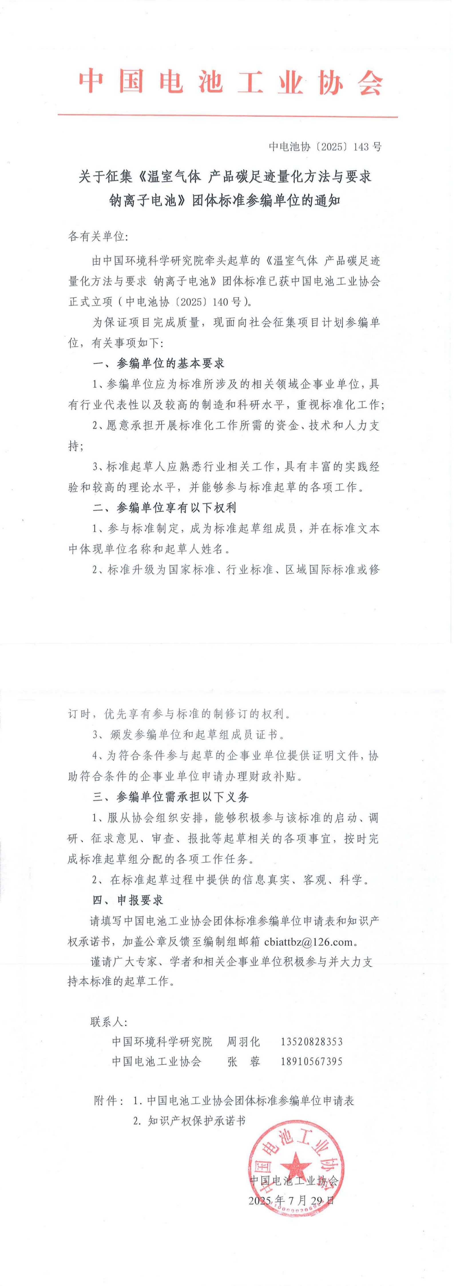 關(guān)于征集《溫室氣體 產(chǎn)品碳足跡量化方法與要求 鈉離子電池》團體標(biāo)準(zhǔn)參編單位的通知