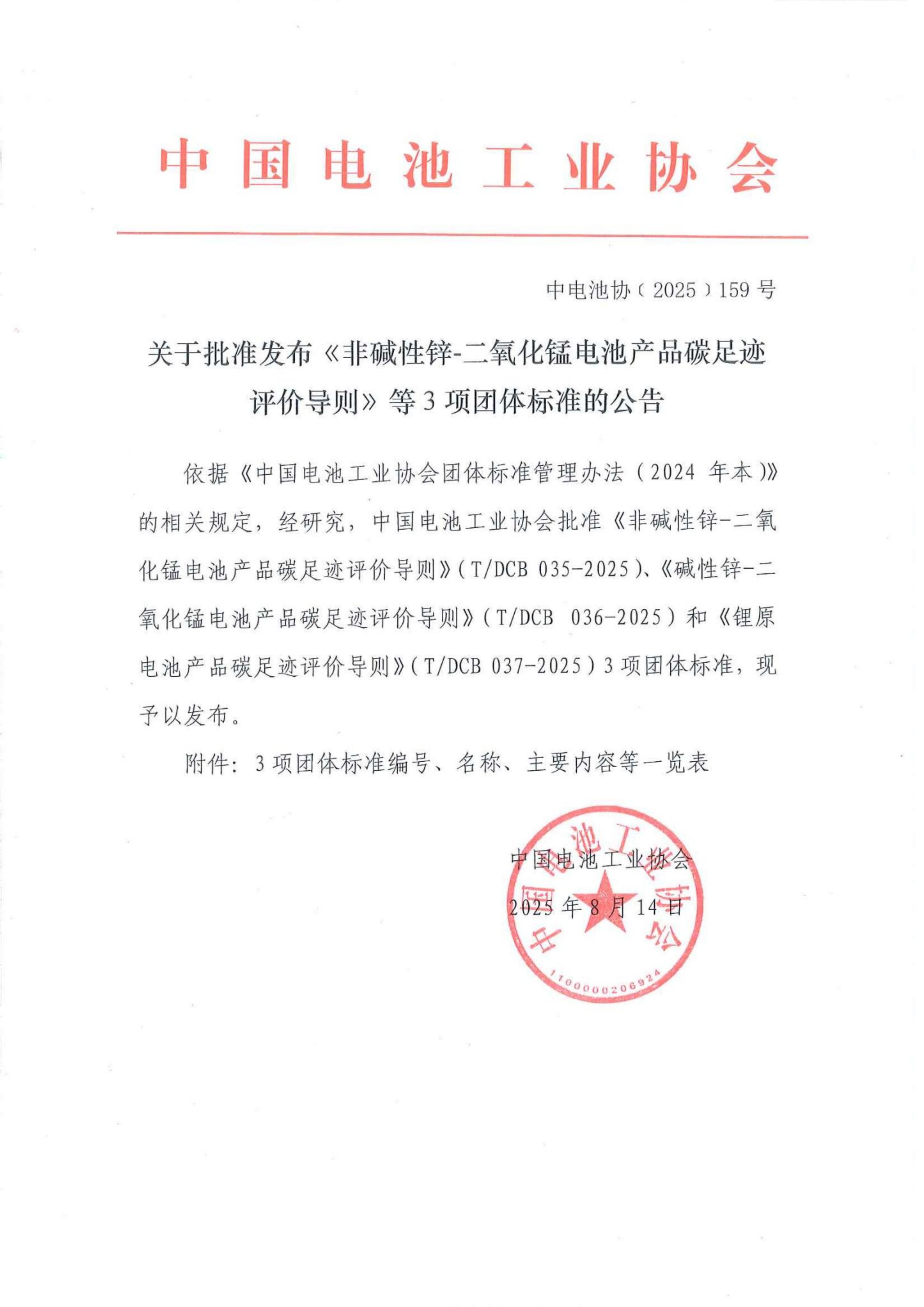 關(guān)于批準發(fā)布《非堿性鋅-二氧化錳電池產(chǎn)品碳足跡評價導(dǎo)則》等3項團體標準的公告